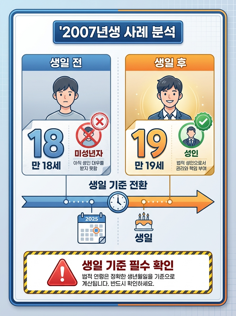| 2007년생 | 만 18세 | 만 19세 | 생일 전: 미성년자 생일 후: 성인 |