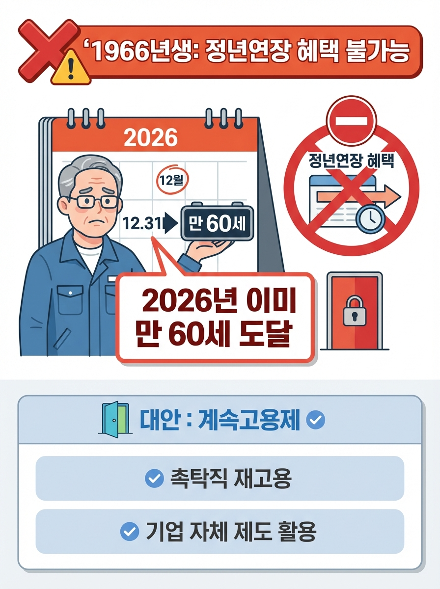 A. 1966년생은 2026년에 이미 만 60세에 도달하므로 법정 정년연장 혜택을 받기 어렵습니다. 다만 기업 자체적인 계속고용제나 공공기관의 재고용 제도를 활용할 수 있습니다.